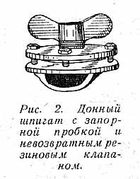 рис. 2 в качестве невозвратного клапана применен мягкий резиновый диск. Если лодка неподвижна или идет задним ходом, то под давлением забортной воды диск закрывает входное отверстие шпигата. При длительной стоянке этот шпигат также завинчивается пробкой.