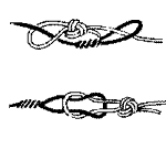 Специалисты довольно точно подсчитали, какой процент прочности теряет леска в тех или иных узлах. Из узлов, показанных на этом рисунке, самые надежные - для привязывания карабина (c) и для привязывания крючка (f). Они сохраняют до 98 % прочности лески.