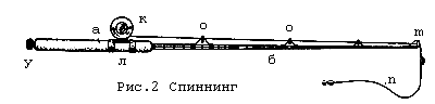 На рис. 2 дан схематический чертёж спиннинга. Он состоит из пробковой или деревянной ручки а и собственно удилища б, которое может быть либо цельным по всей длине, либо состоять из двух или трёх колен. На ручке крепится, катушка к при помощи катушкодержателя л. На стержне удилища прикрепляются пропускные кольца о, через которые пропущен шнур — леса. Самое верхнее кольцо т — тюльпан — является одной из ответственных деталей удилища. К концу пропущенного через кольца шнура привязывается груз; при помощи застёжки к грузу прикрепляется поводок л, к которому присоединяется блесна. Когда применяют тяжёлые вращающиеся блёсны, вместо груза ставят противозакручиватель.