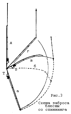 Дальнейшее движение удилища не оказывает особого влияния на полёт груза, и если удилище оставить в положении г, то леса будет испытывать только трение о кольцо тюльпана. Спиннингист должен заботиться о том, чтобы обеспечить полёт груза с минимальным сопротивлением, так как иначе он будет терять в дальности заброса; поэтому он должен так поставить удилище (положение д), чтобы трение лесы о кольца было наименьшим. Следовательно, направление удилища должно совпадать с направлением вытягиваемой лесы, что на рисунке изображено линией, параллельной направлению стрелки (д).