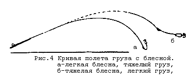 Если бы шпулька не имела инерции и не было бы никакого сопротивления вращению, то это направление было бы действительным направлением полёта. Но так как шпулька обладает инерцией и испытывает при вращении сопротивление от трения, некоторая часть энергии, накопленной грузом за время взмаха удилища, должна расходоваться на 'приведение шпульки во вращательное движение. Благодаря этому груз изменит первоначальное направление своего движения и потеряет некоторую часть приобретённой скорости. За время дальнейшего своего полёта груз будет тащить за собой лесу и преодолевать сопротивление воздуха, что вызовет постепенное уменьшение его скорости. Кроме этих сил, во все время полёта груза на него будет действовать сила тяжести, благодаря чему он будет снижаться, описав в воздухе кривую. Характер этой кривой и положение груза с блесной во время полёта изображены на рис. 4. На практике легко наблюдать, как леса, вытягиваемая грузом, опускается, сохраняя форму пологой кривой.