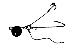 Снасточка "Драшко": к заводному колечку присоединяются грузило, жесткая проволока с загибом (вводится внутрь рыбки), поводок с тройником, медная проволока (обматывается вокруг головы рыбки, надежно фиксируя ее) |